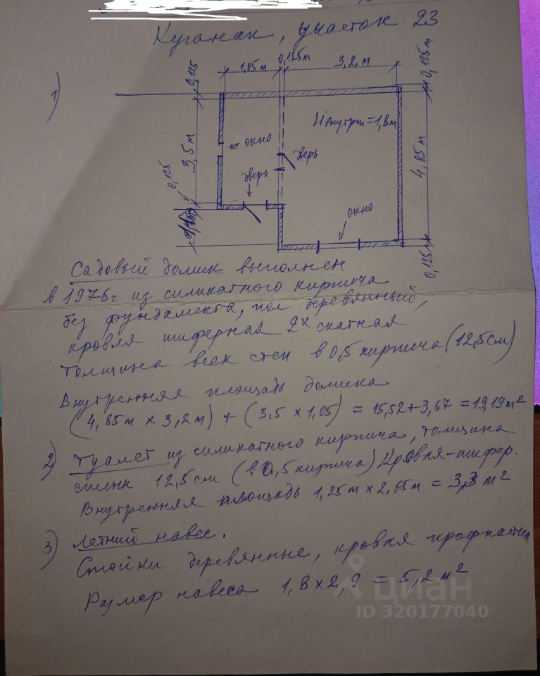 Продается сад в СНТ "Куганак" участок 23-2 (во втором массиве). Удобный подъезд. Кирпичный домик площадью 19 кв.м. на участке 4 сотки. Отопление печное. Кровля заменена в 2023 году. Электричество проведено в дом. Оплата за электроэнергию по счетчику. Мебель остается. Имеется летняя столовая с освещением, кирпичный хозблок. Вода подается по графику 5 дней в неделю. Ухожен, имеются все насаждения. Хорошие соседи. Все документы на землю и дом оформлены. Продажа ввиду преклонного возраста. Торг при просмотре.