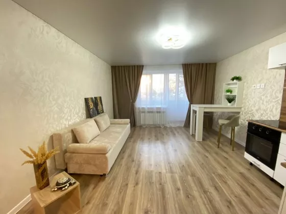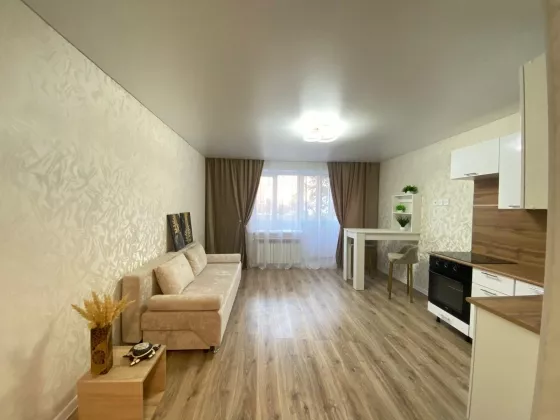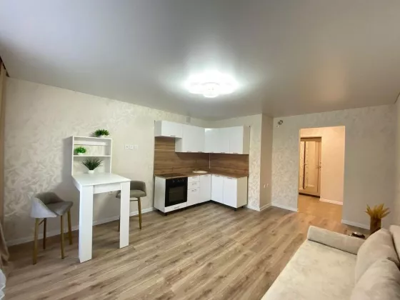 Квартира-студия в новом доме по адресу: ул. Кочетова, 31а. Дом кирпичный, 2016 года постройки, 1-й этаж из 10-ти. ОПИСАНИЕ: —Общая площадь - 27 кв.м —Жилая площадь - 12 кв.м. —Кухня - 7,7 кв.м. —Качественный современный ремонт, после которого никто не жил! — В квартире остаётся кухонный гарнитур, вся мебель,техника, гардины и новое освещение! —Окна пластиковые —Потолки натяжные —Новая межкомнатная дверь —Напольное покрытие - ламинат и плитка —Новая входная дверь с зеркалом —Санузел совмещенный в кафеле —Радиаторы с терморегулятором —Застекленный утеплённый балкон —Аккуратный, чистый подъезд —Во дворе дома современная детская и спортивная площадка —Большое количество парковочных мест —Дом подключён к системе умный дом Ufanet. Видеонаблюдение в лифтах и по всему периметру дома
